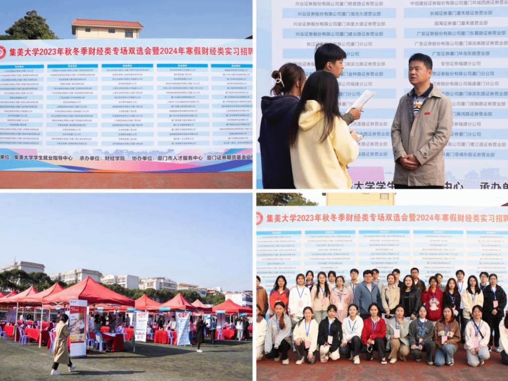 12月2日下午,财经学院于财经学院田径场举办2023年秋冬季财经类专场双选会暨2024年寒假财经类实习招聘会。此次双选会由集美大学学生就业指导中心主办,财经学院承办,厦门市人才服务中心、厦门证券期货基金业协会协办,系集美大学财经学院2023年大学生职业生涯规划与就业指导服务月系列活动之一,共吸引86家企业到场参会。