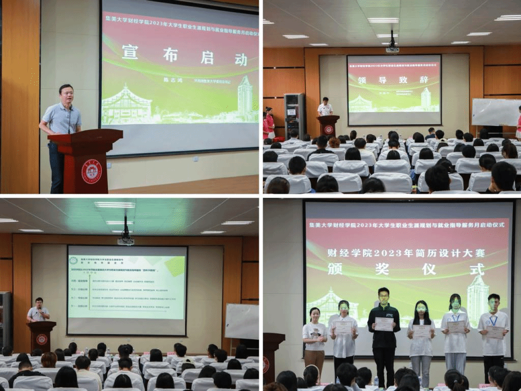 活动中,陈志鸿宣布财经学院2023年大学生职业生涯规划与就业指导服务月启动。黄建宇在活动上致辞,他强调了就业工作对学院事业发展和学生成长成才的重大意义,明确了大学生职业生涯规划对优质就业的重要作用,对财院学子提出了着眼长远,制定科学的人生规划;脚踏实地,锤炼过硬的本领;树立正确的就业观念等三点希望。邹景宇从生涯和就业两个角度出发,介绍了财经学院全面推动“四年不断线”大学生职业生涯规划与就业指导服务的基本情况,并简要介绍了2023年学院大学生职业生涯规划与就业指导服务月各项活动安排。启动仪式上还举行了财经学院2023年简历设计大赛获奖选手颁奖仪式。