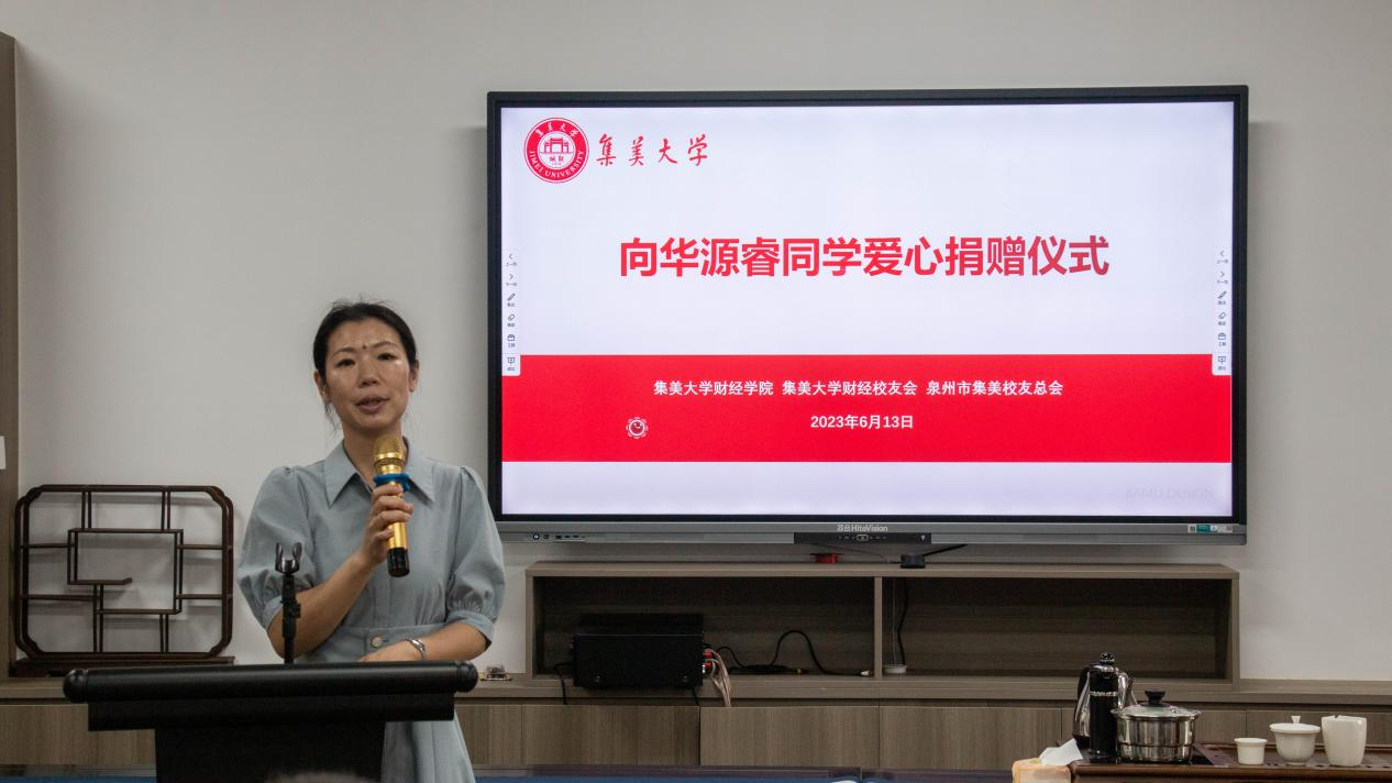 6月13日下午,由集美大学财经学院、集美大学财经校友会、泉州市集美校友会共同主办的“向华源睿同学爱心捐赠仪式”于财经学院校友活动中心举行。财经学院党委书记吴薇、党委副书记黄建宇,财经校友会秘书长周邵生,泉州市集美校友总会副会长吴晓东,泉州集美校友会青工委副主任刘锦清、林丽君,华源睿父亲华为出席,我校师生代表参加。