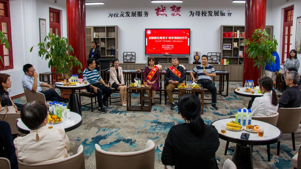 11月15日下午,财经学院于敦书楼二楼校友活动室举办“躬耕教坛育英才 桃李满园绽芳华”2023年下半年教职工荣休座谈会,为会计系骆良彬教授、柴芳云副教授送上荣休祝福。座谈会由财经学院党委副书记、部门工会主席黄建宇主持,院党委书记吴薇、院长黄阳平出席,学院有关师生代表参加。