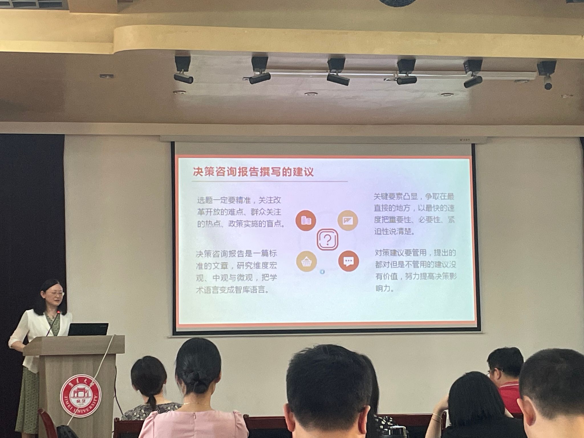 而后,金融系章颖薇教授向新进教师们分享“公共政策评估与决策咨询报告撰写”相关的科研经验。章教授通过案例解析,生动形象地阐述了公共政策评估与决策咨询报告应如何撰写,使得新进教师们更加清晰地了解公共政策评估与决策咨询报告的撰写过程与要点。
