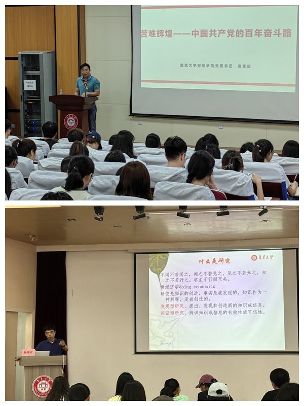 吴星旭从以“苦难辉煌——中国共产党的百年奋斗路”为题,以中国共产党成立以来不同历史时期涌现出的先进典型为事例,为学生党员和入党积极分子系统梳理了中国共产党百余年来为中国人民谋幸福,为中华民族谋复兴的奋斗历程。杨得前代表学院向全体2024级新入学研究生表示欢迎,强调“研究生学习的核心是研究”,从知识溢价、什么是研究、如何做好研究三方面为对2024级新入学研究生进行了指导。