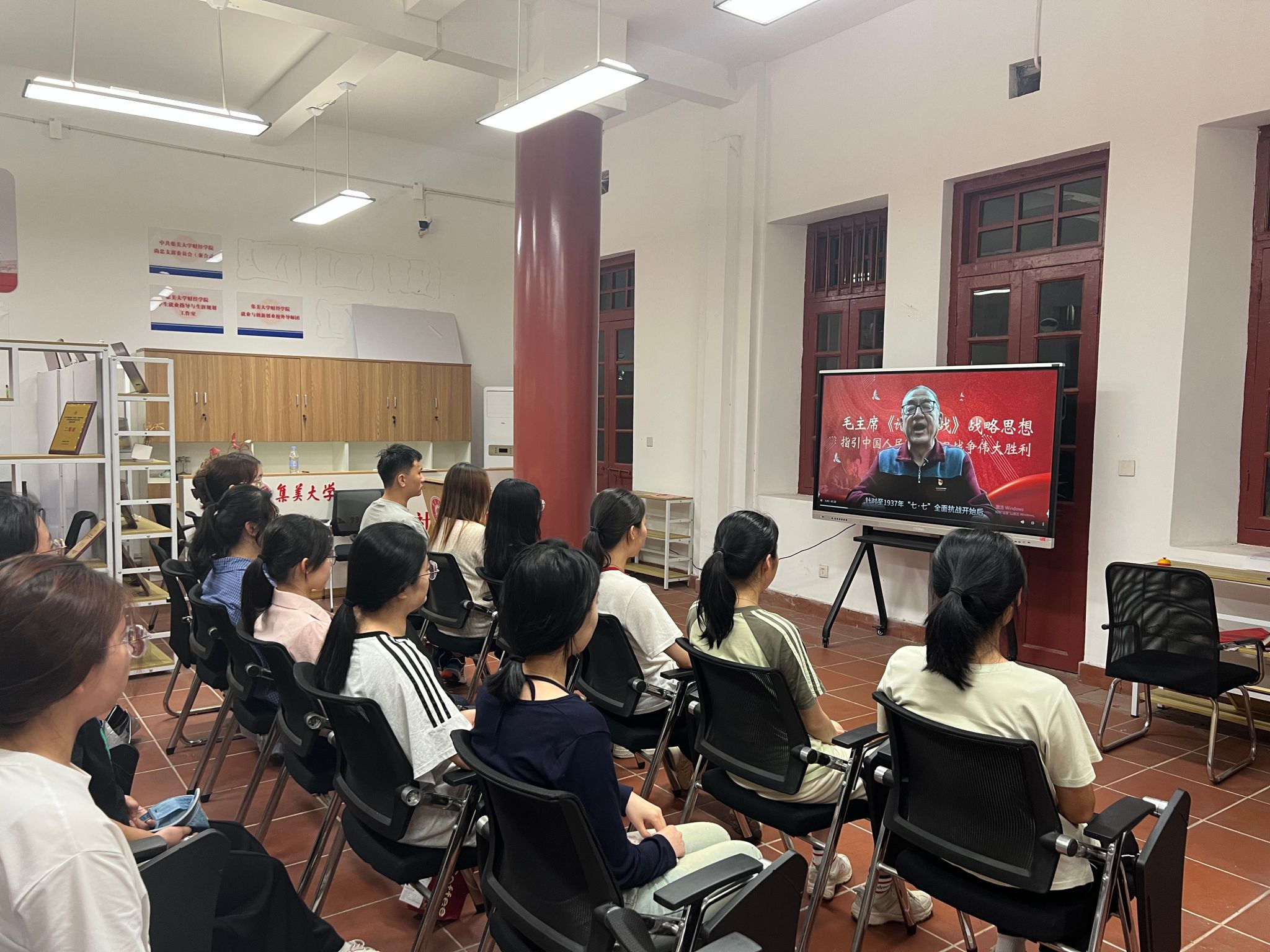 4月19日,财经学院经济系学生党支部在尚忠楼群一站式学生社区组织集中观看“福建五老说第135期——毛主席《论持久战》战略思想指引中国人民取得抗日战争伟大胜利”专题讲座。支部全体党员参加学习。