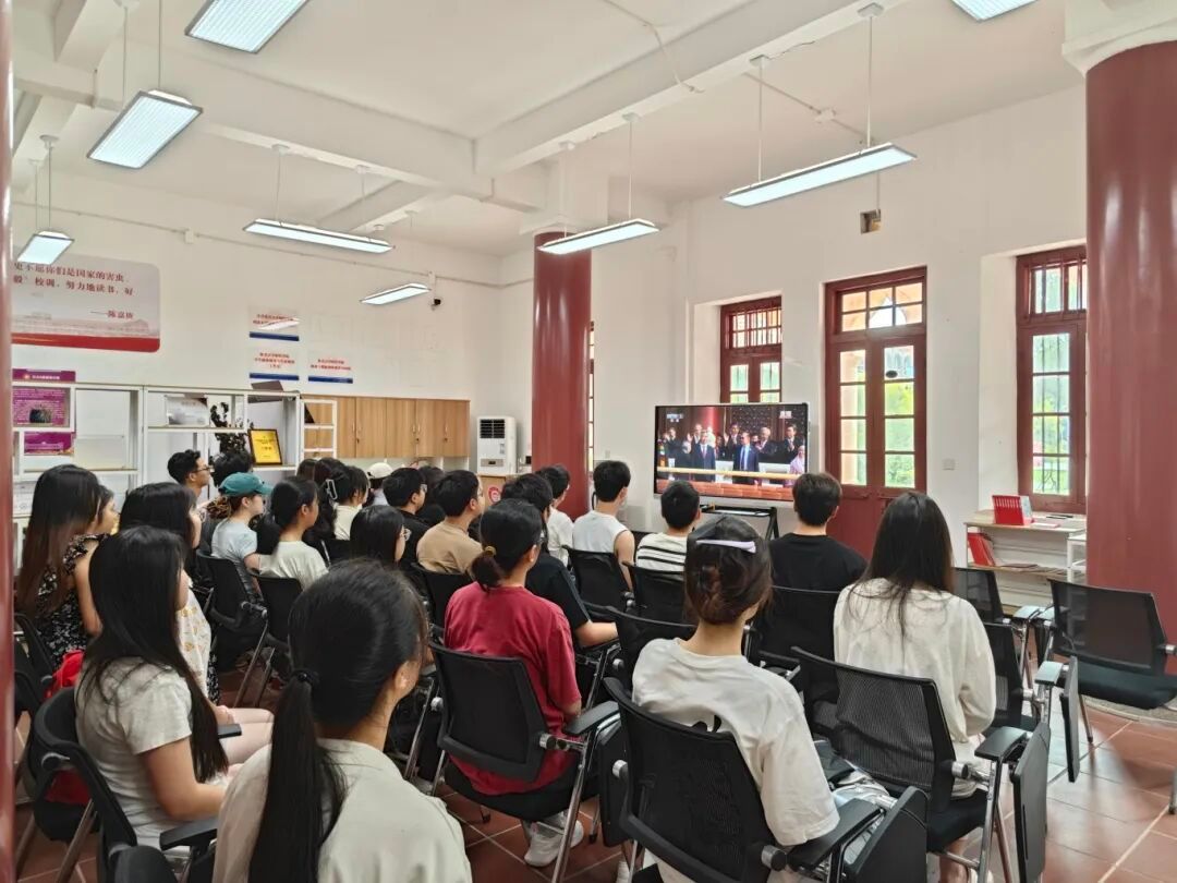 9月3日上午,纪念中国人民抗日战争暨世界反法西斯战争胜利八十周年大会在北京天安门广场隆重举行,习近平总书记发表重要讲话,举行盛大阅兵式。学院党委组织留校师生在文津101、尚忠楼群一站式学生社区中心等集中收看盛况,并组织未返校师生通过电视、手机等平台同步收看。院领导、行政干部、教师代表、辅导员和留校学生一百余人在现场参加活动。