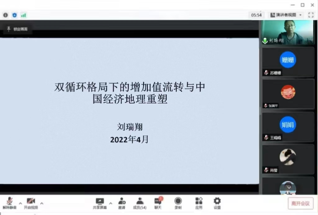 刘瑞翔以我国构建双循环新发展格局的背景切入,结合文献综述为同学们深入讲解影响经济地理分布的因素。同时他利用2002-2017年国际和国内经济地理格局演变的相关图表数据,严谨生动地解释增加值的理论模型,并用此模型详尽分析价值链分工下的增加值流转及其对经济地理分布的影响。随后,他分区域、分行业指明双循环格局下价值链重构对增加值流转和经济地理分布的影响,提出相应对策建议。最后,他鼓励同学们学好专业知识,提高自我学习能力,以适应经济发展人才需要。会后,与会师生还就构建双循环新发展格局相关问题进行深入交流探讨,气氛热烈。