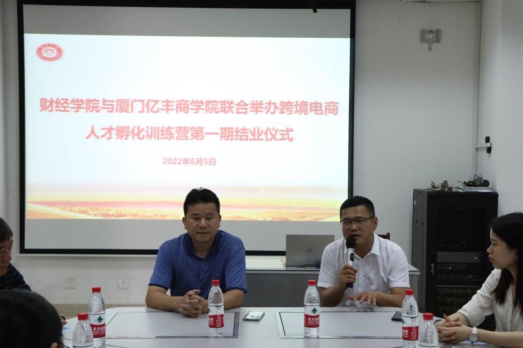结业式上,黄阳平和曾振华分别代表学院和企业致辞。黄阳平代表学院对亿丰商学院跨境电商公益性培训表示感谢,表示应加强校企合作新平台、新模式、新品牌的探索,在数字经济背景下共创校企合作的新路径,助力财经传统专业的数字化转型升级,同时对训练营学员积极求学的态度表示肯定,鼓励同学们抓住机会,努力学习知识、提升能力,继续参加下一期高阶训练营。曾振华则指出跨境电商是国际贸易的一种新形式,是数字贸易中发展的重要形态,他表示同学们应深入了解该行业情况,充分掌握国家政策设计,为推动中国制造走出国门而贡献力量,亿丰商学院希望携手财经学院培育厦门本土跨境电商土壤,致力打造数字经济及跨境电商校企合作领军团队。