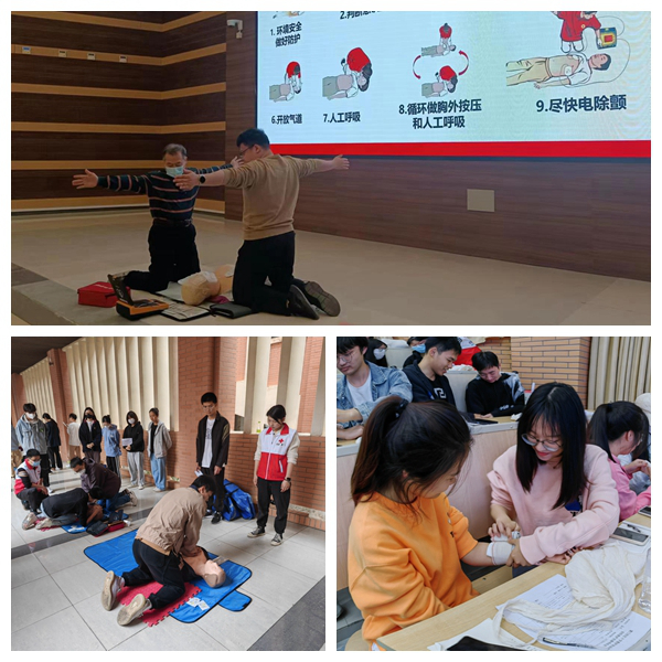 在前期线上理论学习中,全体参训学生干部系统学习了红十字基本知识、CPR(心肺复苏)标准操作流程、AED(自动体外除颤仪)使用方法以及常见应急伤害事故的处理措施等理论课程,并全员通过线上理论考试。在为期一天的实操培训中,全体参训学员在红十字急救教练的指导下,分组开展CPR+AED院前急救和常见创伤紧急包扎等实操练习并逐一接受考核。