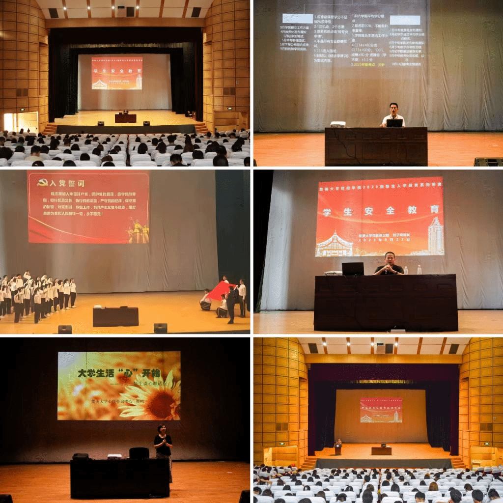 汤镇福进行教学管理制度解读与实验安全教育,以“学分去哪了”为题,强调考试作弊的零容忍性,说明转专业和推免生的必要条件。邹景宇主讲学生管理规定与纪律教育,引导新生从学生手册中了解评奖评优和违纪处分的相关规定,增强纪律意识,提升实践能力。戴贵芬为全体新生做入党启蒙教育,详细讲解入党条件和流程,带领全体新生共同见证2023年新发展党员入党仪式,勉励新生以优秀党员为榜样,积极向党组织靠拢,早日成为一名光荣的共产党员。刘子奋主要以四个安全专题为切入点,即国家安全、消防安全、反诈安全、其他安全,他以尚忠楼群为例强调消防安全的重要性,同时也警示新生们注意甄别诈骗信息,刘子奋还在交通安全、食品安全、网络安全方面为同学们做了补充说明。讲座最后,院党委副书记黄建宇做总结发言,他再次从基础疾病、消防隐患、诈骗风险以及假期注意事项方面强调提醒,告诫同学们提升安全意识。周鸣为大一新生带来有关心理适应的讲座,她从生活环境的变化、人际关系的变化、学习的变化、社会角色与自我定位的变化四个方面谈及大学新生活将面临的变化,并为新生提供相关应对策略,意在培养同学们健康的心理素质和积极进取的乐观心态。