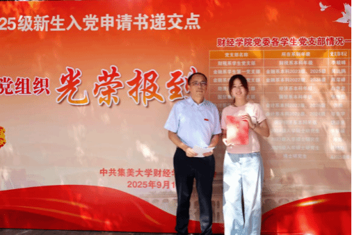 今年,财经学院党委特别设立了“向党组织报到”点,专门接受2025级新生在入学当天递交的入党申请书。迎新现场,集美大学党委副书记、校长谢潮添教授代表学校党委接收2025级新生递交的入党申请书。迎新当天,截止下午5点,报到点共收到入党申请书近300份,这不仅是一份申请的提交,更是一颗赤子之心向光而行的开始。随后,谢潮添来到尚忠楼群一站式学生社区与新生代表亲切交流,勉励新生秉承“诚毅”校训,踔厉奋发,砥砺前行。