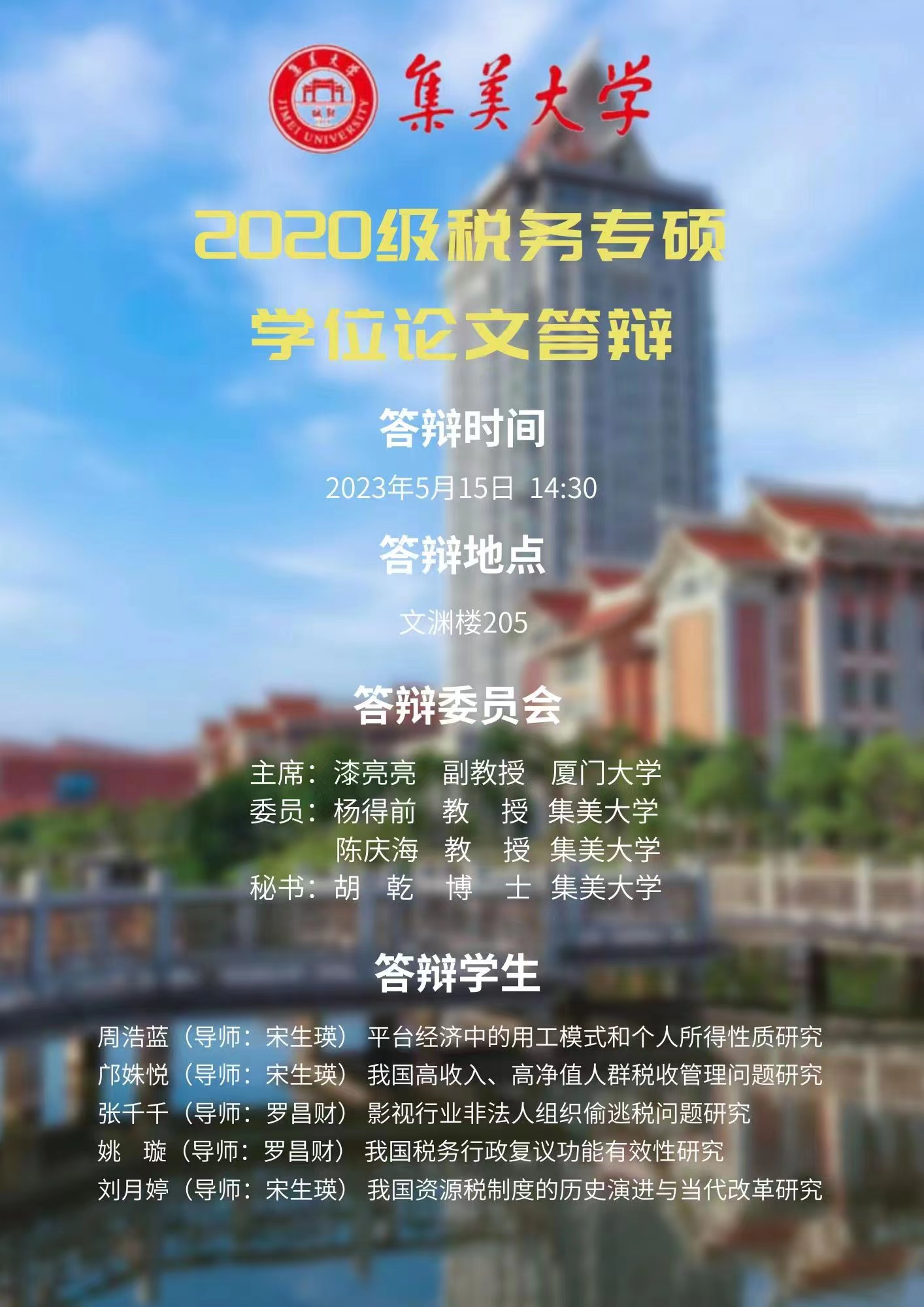 地址:厦门集美区集岑路1号 电话:6181251(综合办),6181340(教学办),6181025(研究生招生) 邮箱:cjxyzhb@126.com