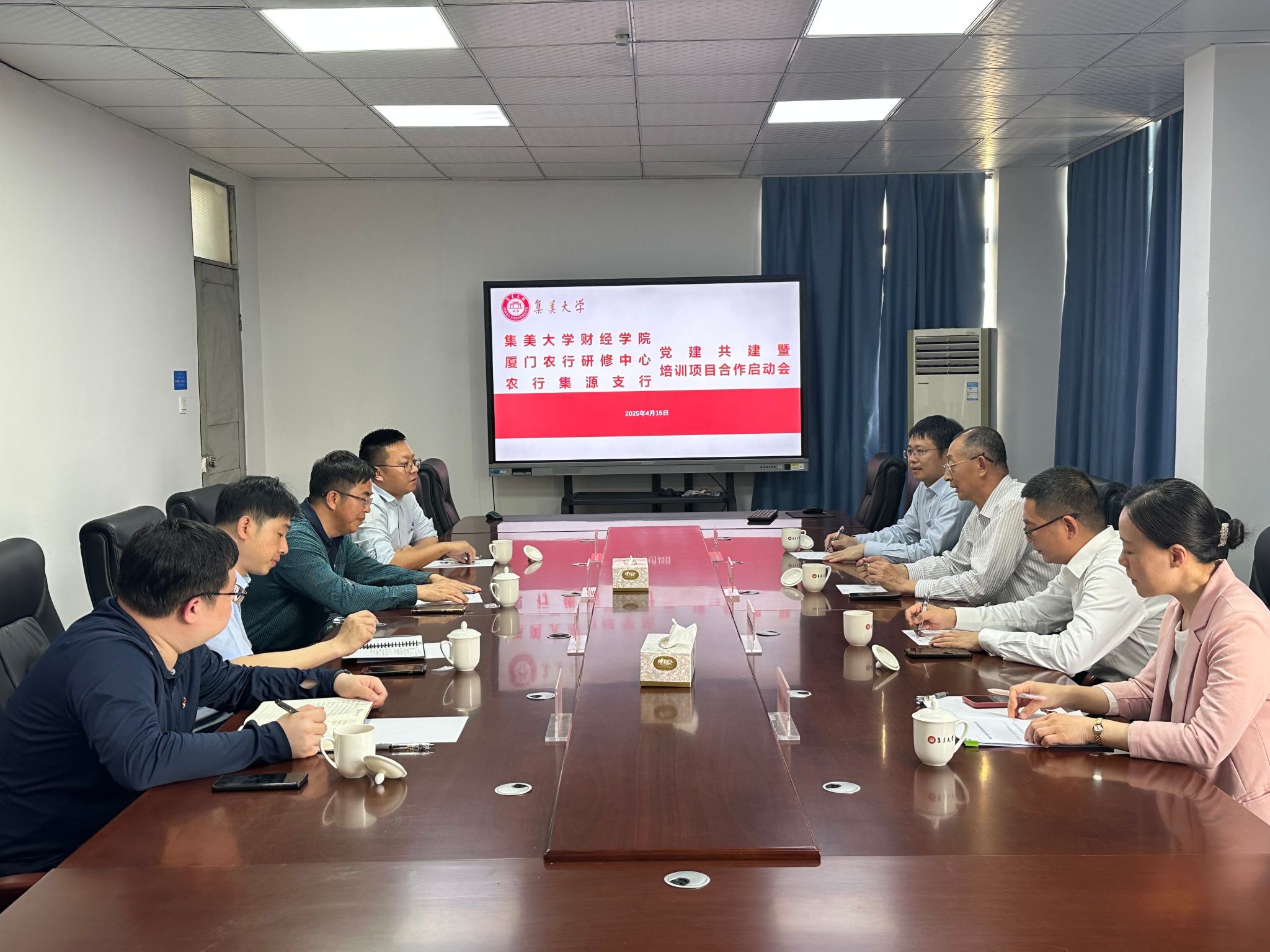 4月15日下午,中国农业银行厦门分行(后简称:厦门农行)一行莅临学院,双方共同举办党建共建暨培训项目合作启动会。财经学院党委书记吴星旭,副院长沈少川,厦门农行研修中心主任李云峰、副主任朱志强、培训部经理郭宏,财经学院校友、农行集源支行行长肖文开,学院相关科室负责同志等参加会议。