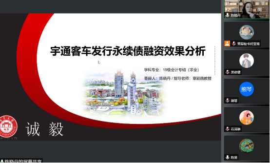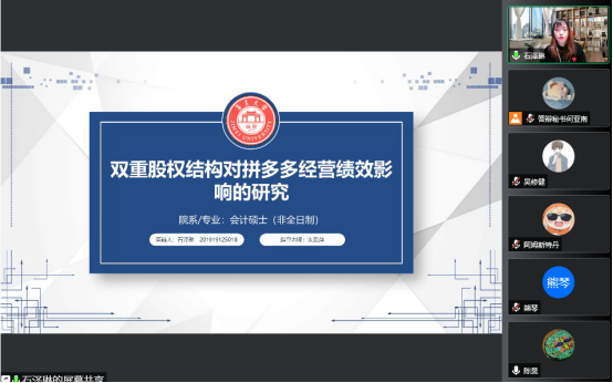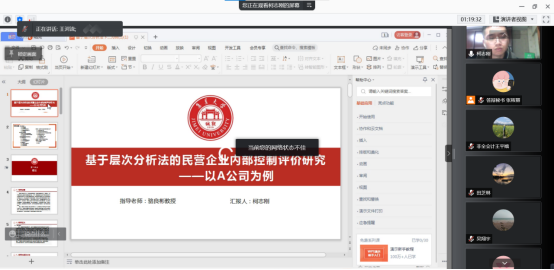 经过前期的精心筹划和准备,采用网络视频的形式进行了答辩。在答辩过程中,每位研究生首先通过展示精心准备的PPT,从选题背景,研究意义,理论基础,基本内容,案例介绍等方面进行陈诉,阐述了自己毕业论文的主要内容和基本框架。再由答辩老师严格把关,对论文的选题、结构、内容及写作思路提出自己的看法和建议,答辩老师指出专硕论文要以问题为导向,案例分析应该由一般到特殊,然后再到一般,通过深入的分析,归纳出具有普适性的借鉴意义与一般规律。答辩研究生在论文答辩的过程中,认真记录答辩老师对自己论文提出的问题和修改意见。整个答辩过程组织严谨,流程规范,符合我校硕士毕业论文工作实施细则相关要求,收到了良好的效果。师生们打破时空限制,在云端进行思想的碰撞和知识的交流,线上学术讨论氛围热烈,也令参会的学弟学妹受益匪浅。